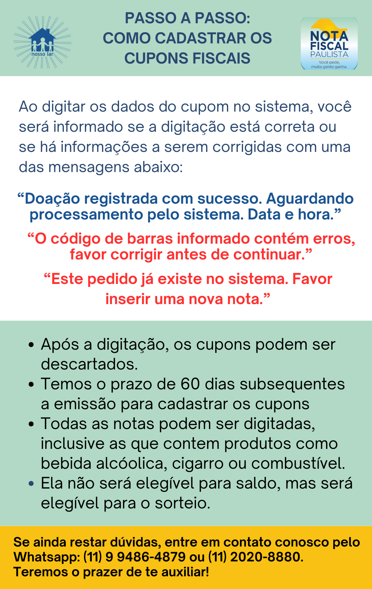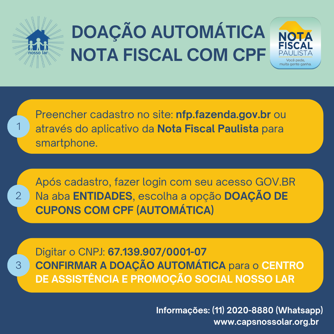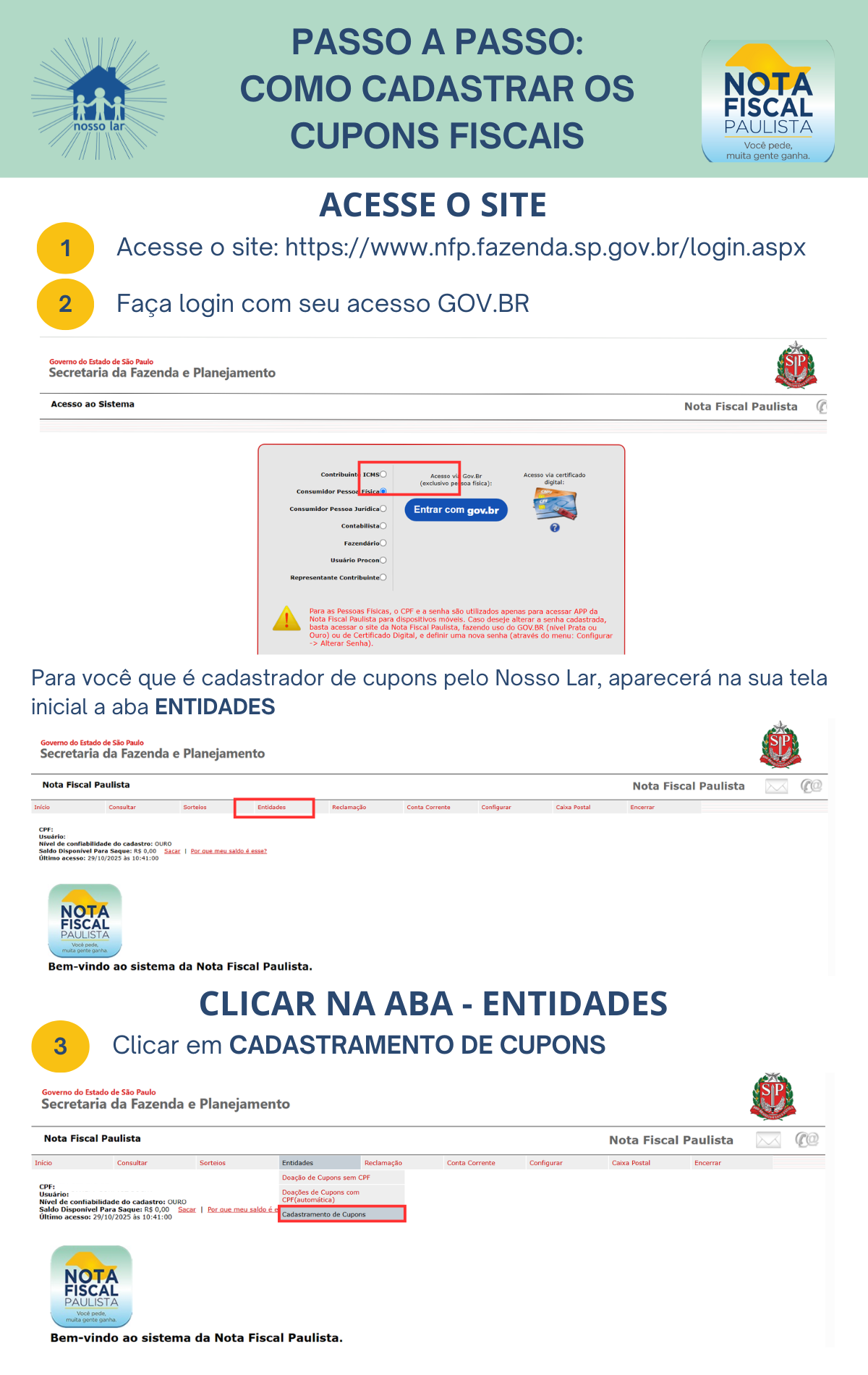 O Nosso Lar cadastrará o cupom fiscal em seu CNPJ, através do site da Nota Fiscal Paulista, realizando a transmissão dos créditos da nota para a entidade.