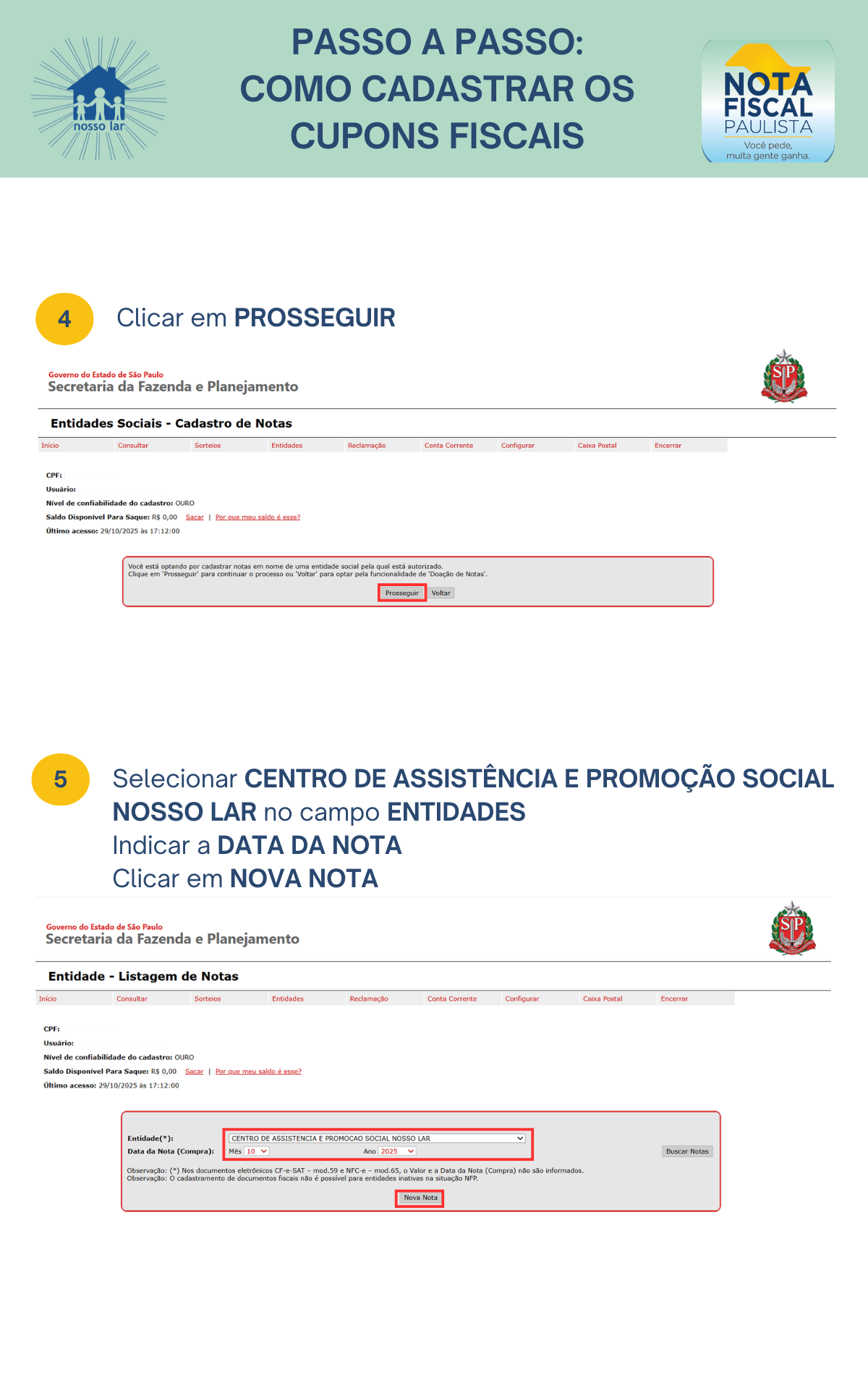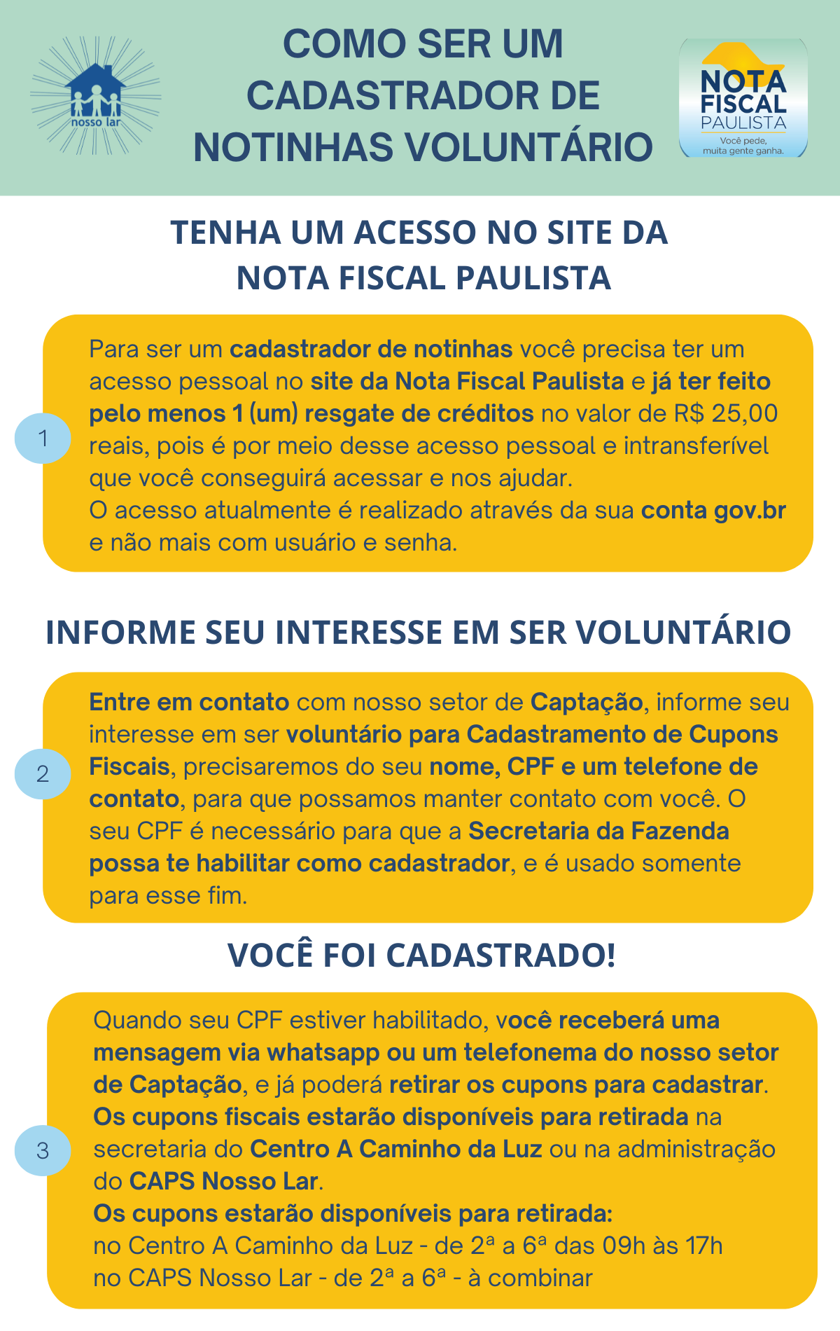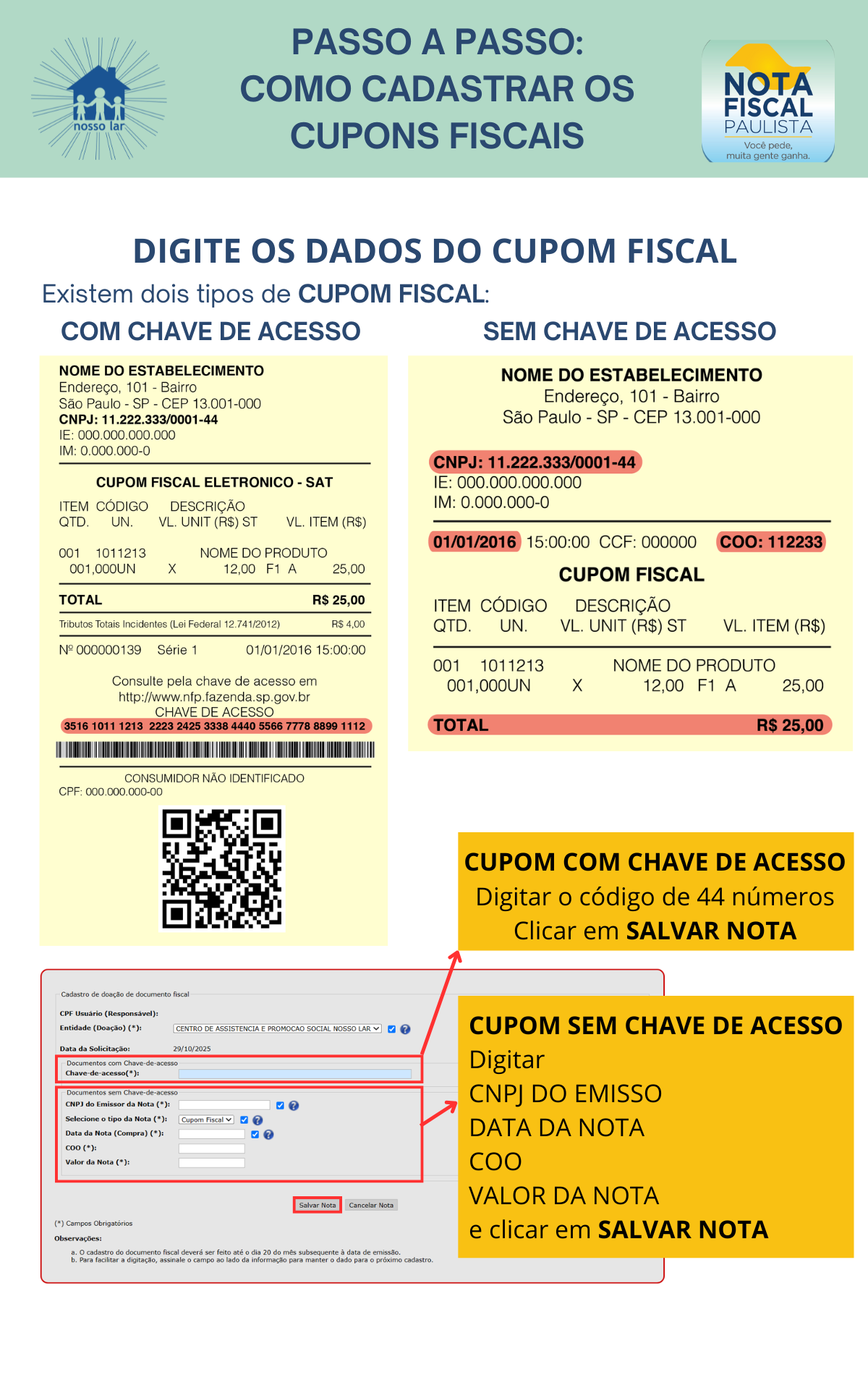 O Nosso Lar cadastrará o cupom fiscal em seu CNPJ, através do site da Nota Fiscal Paulista, realizando a transmissão dos créditos da nota para a entidade.